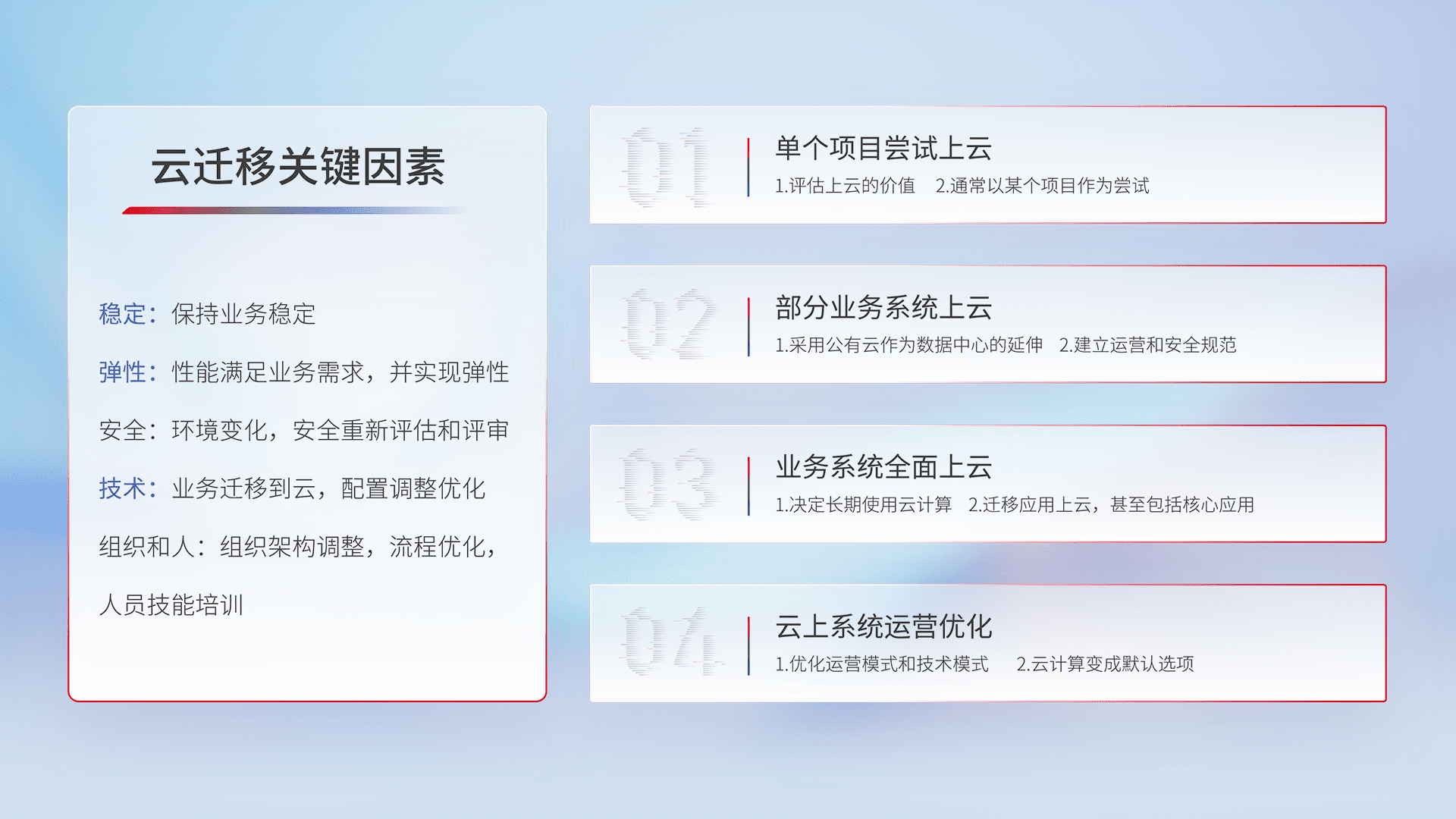 结合实际业务,,从规划设计、、、、云平台选型、、、云原生改造、、、、数据迁移、、、集成交付,,,,迁移全过程为客户识别最佳上云路径,,做好风险识别管理,,,设计网络架构、、、身份权限、、、安全审计合规、、、操作审计、、、日志审计、、、、监控告警策略、、多站点容灾设计等,,,对云上基础设施进行整体规划,,,,提升IT治理水平,,,,以满足弹性、、、高可用、、、高性能的需求。。。。