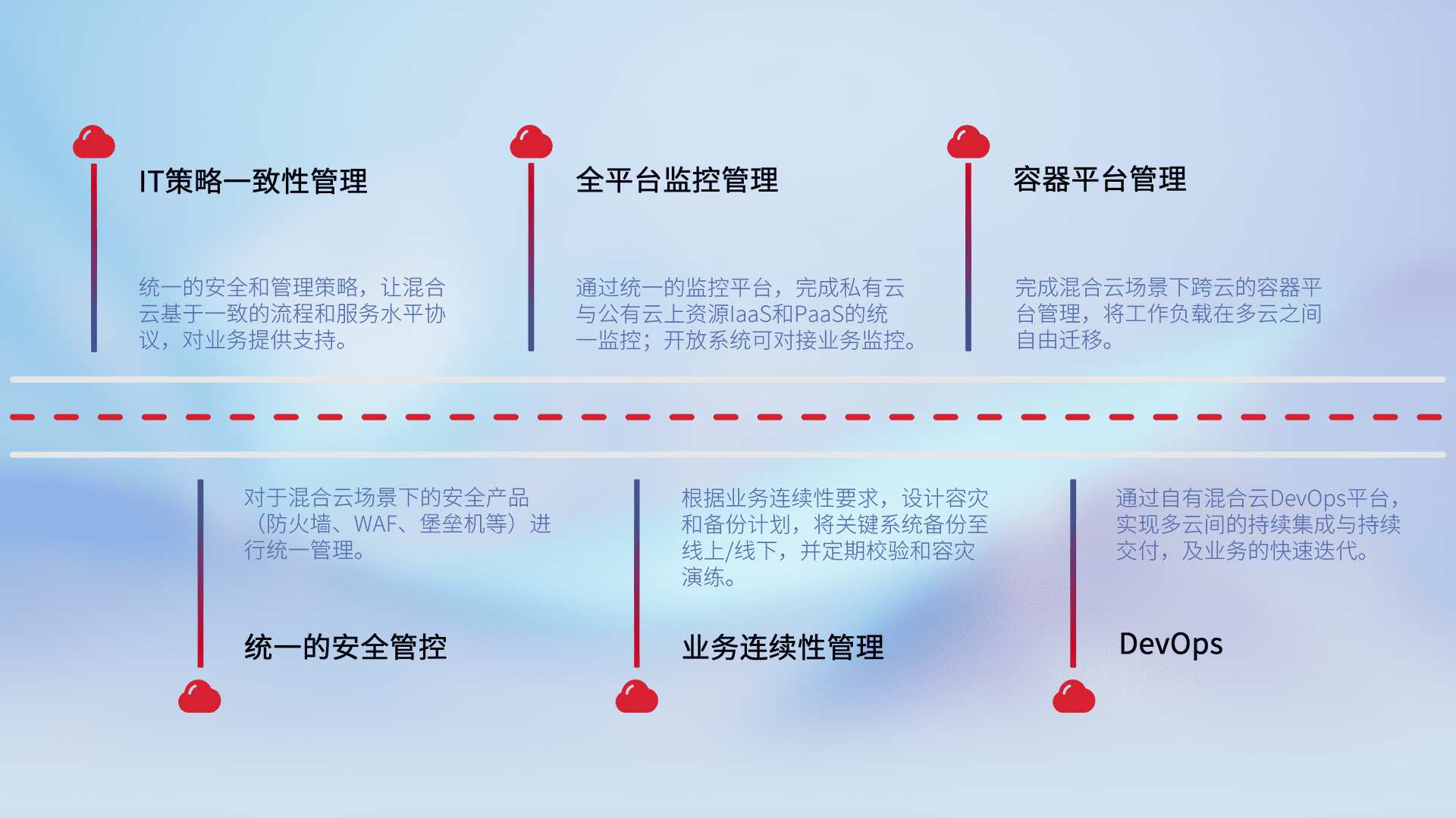 通过多云纳管,,,以统一的资源数据模型把客户的云资源进行抽象和封装,,,进而实现对多云资源的统一操作,,保障云资源管理的可靠性、、、稳定性与可用性。。量身定制化运维内容,,,配置、、、开发运维、、、补丁管理、、、、备份、、、、监控、、、、认证和访问管理、、、审计和日常巡检等,,保障在用云过程中的可靠度,,,稳定度以及高可用率。。。。